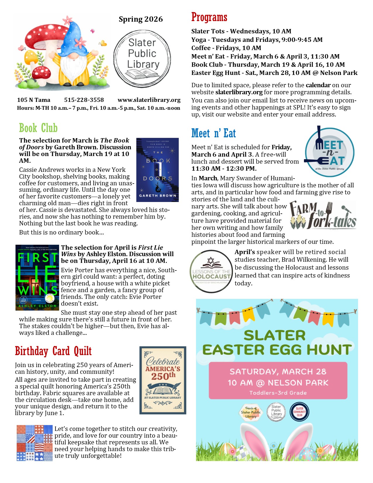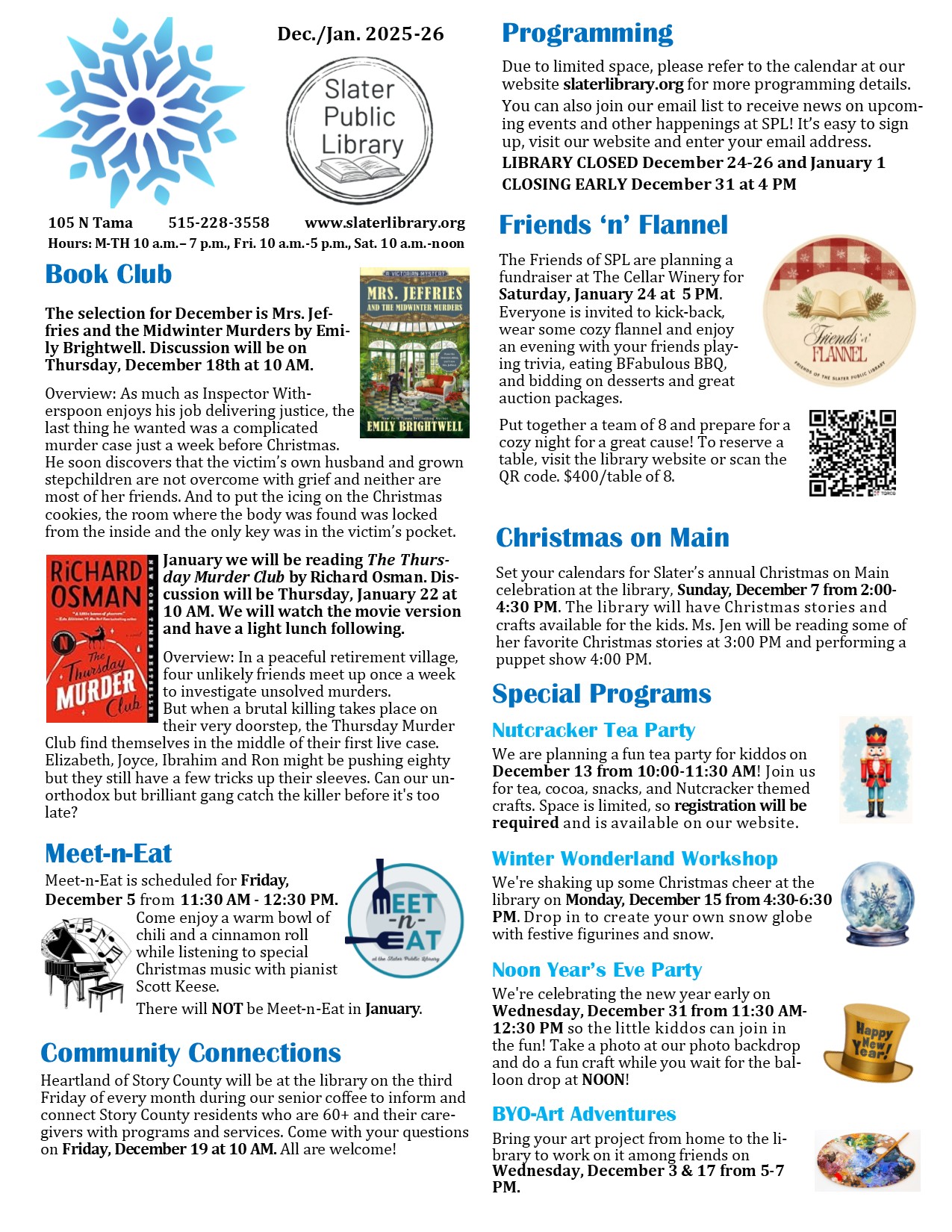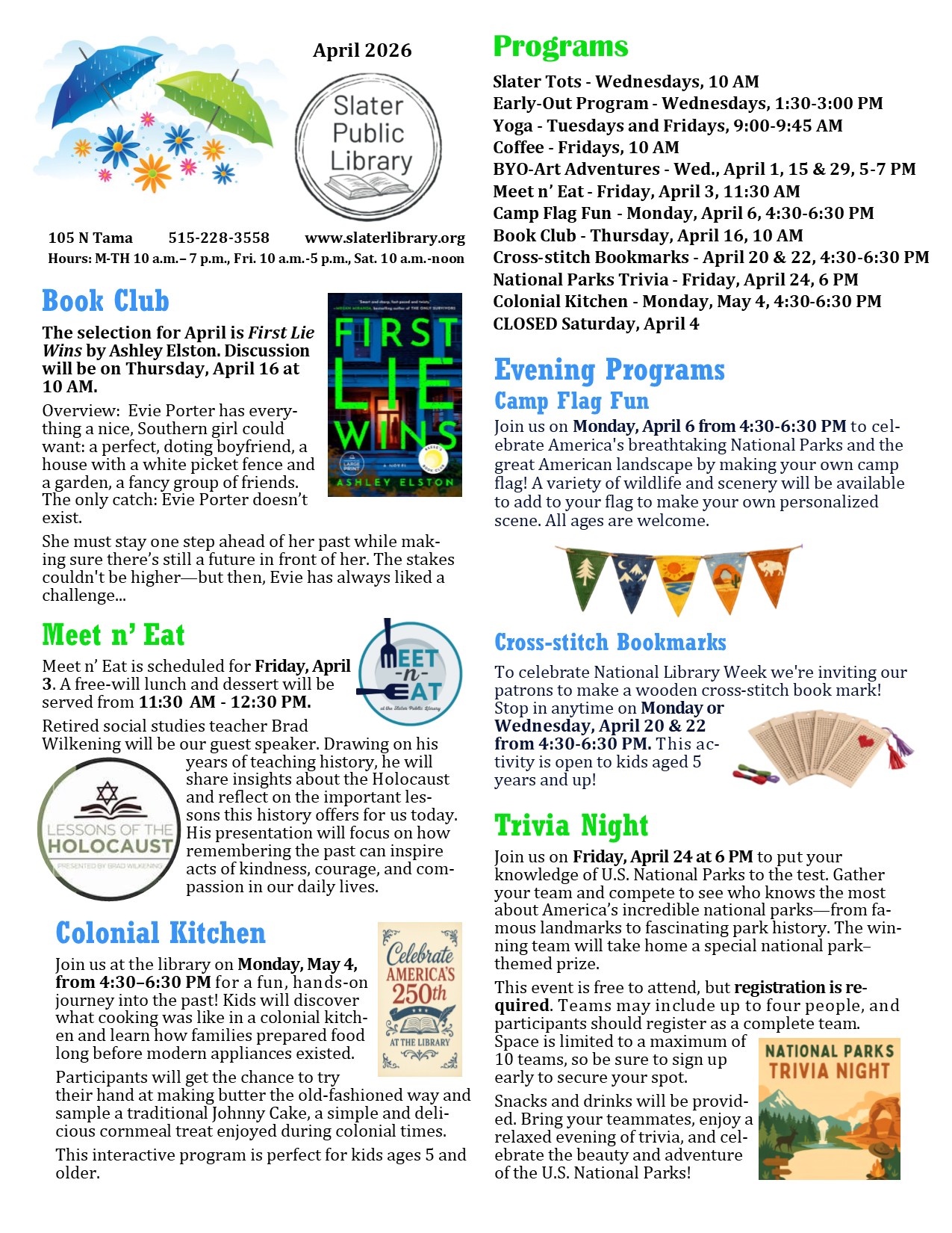 The Slater Public Library provides a variety of free programs for all ages. Please see our calendar for a complete listing of all upcoming programs.