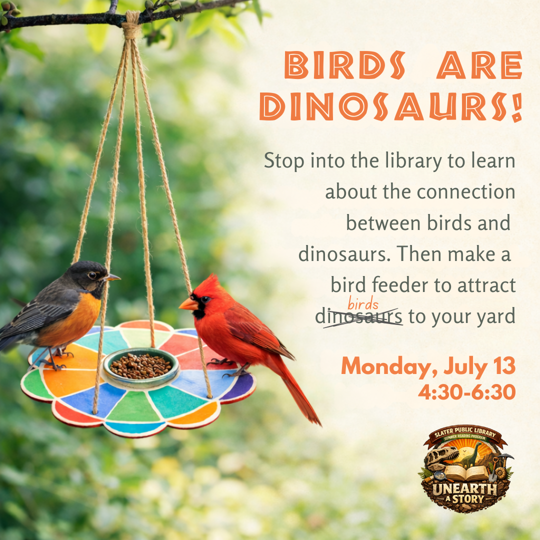 Stop into the library to learn about the connection between birds and dinosaurs. Then make a bird feeder to attract dinosaurs birds to your yard!
