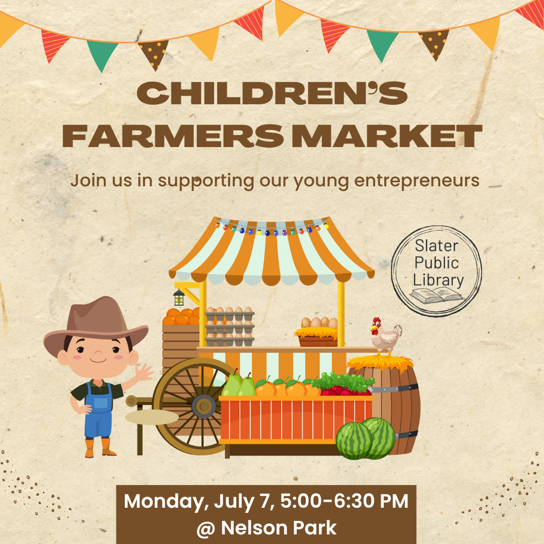 Please join us at the library as we support our community's young entrepreneurs at the Children's Farmers Market. Snack mixes, lemonade, sweets, crafts, flowers, vegetables, jewelry, and so much more! If your child/ren are interested in signing up to have a stand at the market, we're going to have an informational meeting for families, on Wednesday, June 11 at 6 PM, where we'll talk through a basic business plan (possible items to sell, pricing, signage, & other logistics). We'll also release the Google Form sign-up that same night. Then we'll have a follow-up, drop-in opportunity for kids who have committed to having a stand at the market. This will give us time to discuss how the planning is going, answer any questions the kids might have, offer a monetary change-making practice session, etc. We'll also have some poster-making supplies on hand, so if the kids want to make a sign for their stand here at the library, they're more than welcome to.